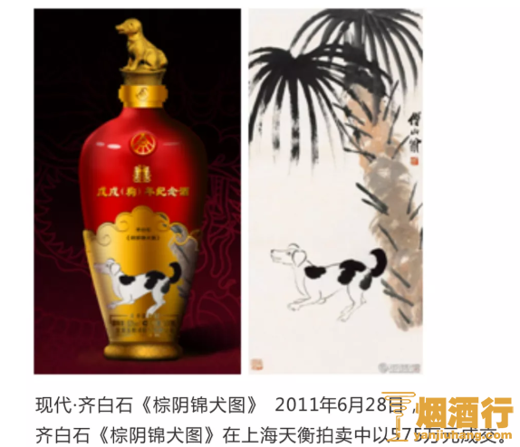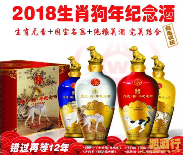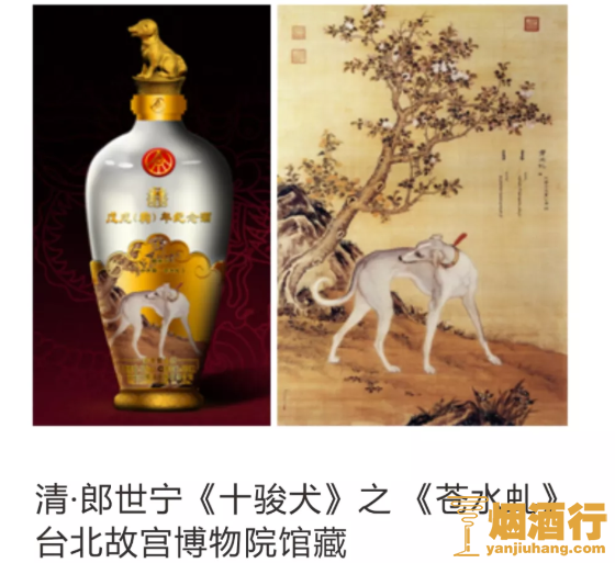 集中国酒文化、生肖文化、书画艺术、吉祥文化于一体的重磅文化纪念酒!全套4樽,瓶身主图分别以郎世宁《十犬图·苍水虬》、任伯年《花鸟三屏》、齐白石《棕阴锦犬图》、徐悲鸿《十二生肖图册·狗》为蓝本设计,开瓶喷香浓郁,口感醇厚甘美,回味悠长。