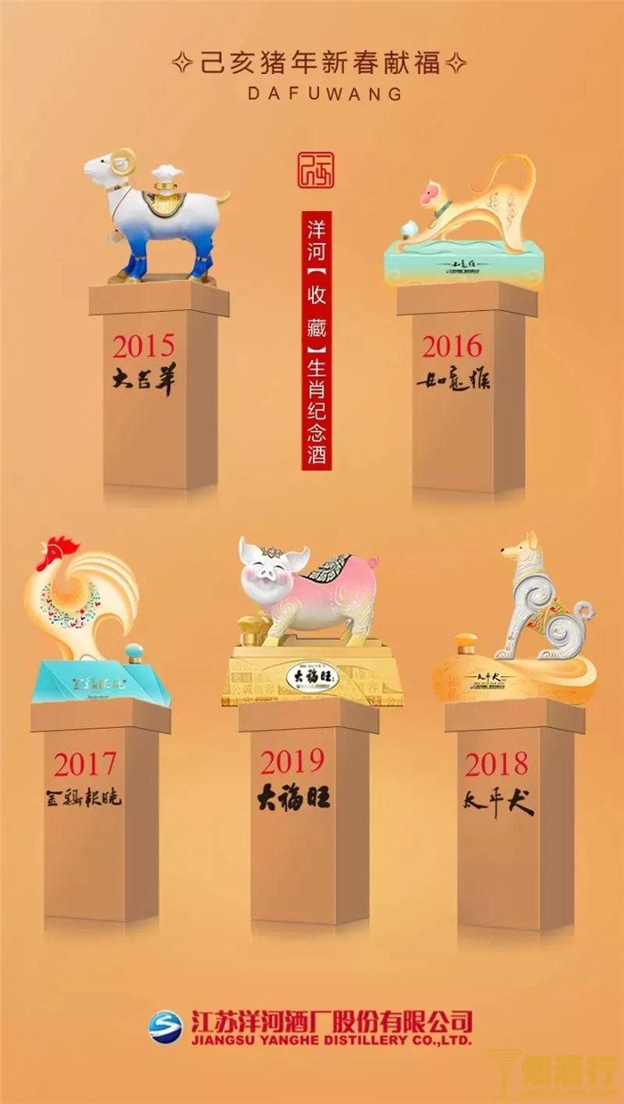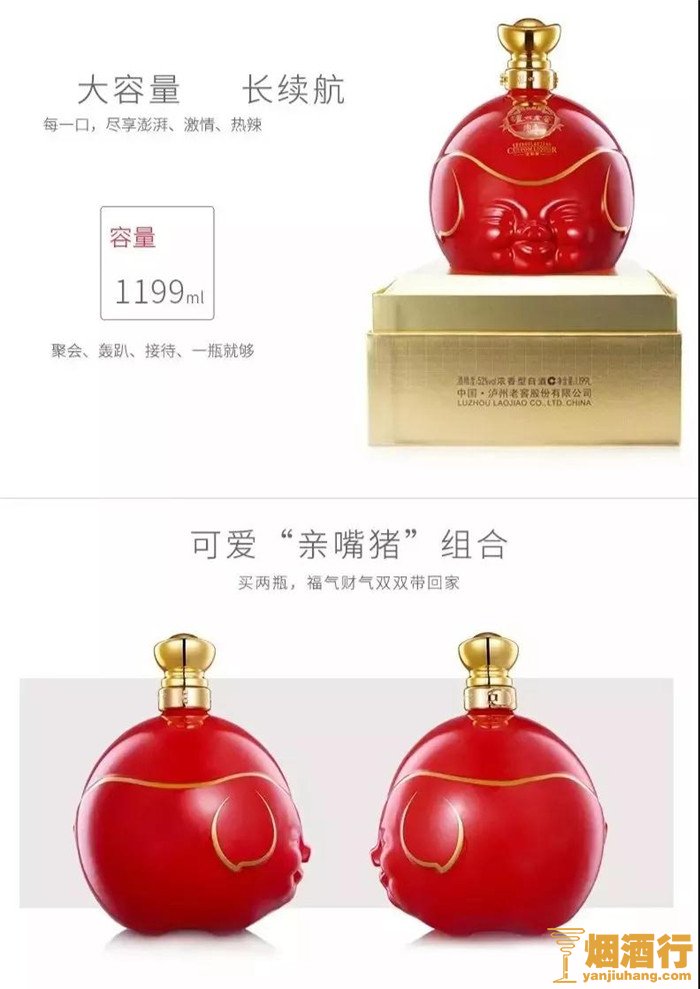 洋河猪年生肖酒名为「大福旺」。预售价1880,2月4日后正式发行价2280。造型可爱,高度白酒主打收藏,限量200樽,极度稀缺,在京东洋河官方旗舰店销售。
