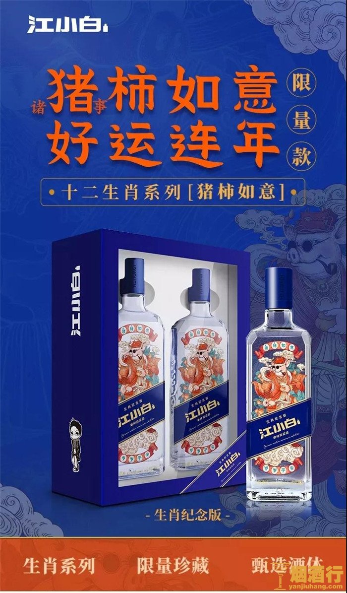 江小白应该是年轻人饭桌上出场率最高的白酒,猪年纪念酒名为:「猪柿如意」(通:诸事如意)。和其他高度生肖酒不同,江小白依然主打低度白酒,更适合自饮。