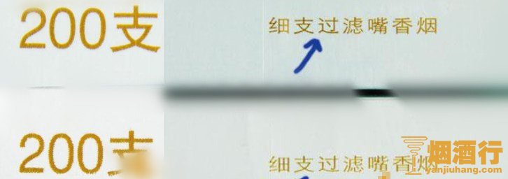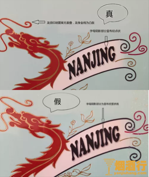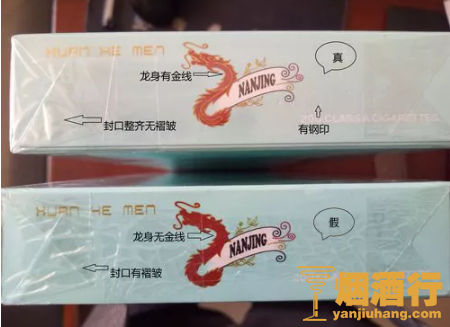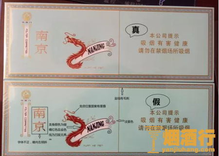 看条盒颜色:真烟为淡蓝色,颜色柔和纯正;假烟为浅蓝色,视觉上颜色不是自然色。看条盒图标,真烟“南京”二字字体端正清晰,龙须印刷图案无重叠,龙身金线为凸版,条盒金边无毛刺;假烟“南京”二字字体向左微倾,龙须有叠痕错层,龙身颜色为褐红色、金线为凹版,条盒金边有毛刺。