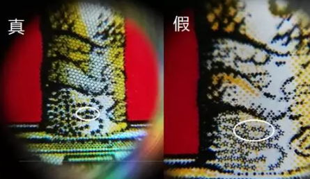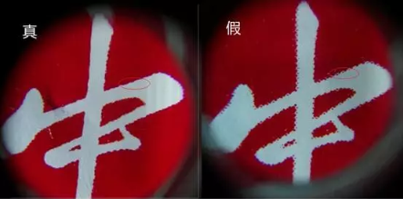 真品条盒及小盒在华表的基座位置用放大镜可以看到有黑色“★”和黄色“YC”字母,真品条盒及小盒黑色“★”是实心的,边缘清晰不模糊;假烟黑色“★”一般为空心的或者“★”成梅花状,且边缘较为模糊。软硬中华真假烟鉴别图解中:真烟华表柱及图案立体感强,假烟图案模糊,真假比对存在明显差异。