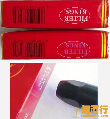 真烟“FILTER KING”字样经紫外光照射后由白色变成紫红色,停止照射后,紫红色会逐渐消退;“FILTER KING”字样经紫外光照射后不变色的为假烟。.鉴别真假“中华”时需要借助紫光灯、放大镜等检验工具。