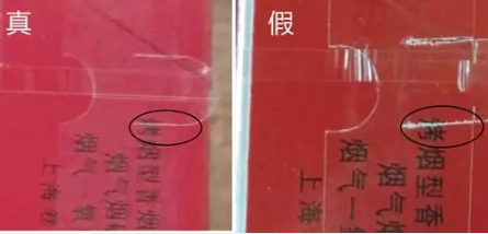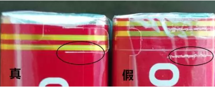 真品硬中华小盒拉带头为半圆形,边缘光滑无毛渣;假烟小盒拉带头半圆形不规则,边缘不够光滑,有毛渣。