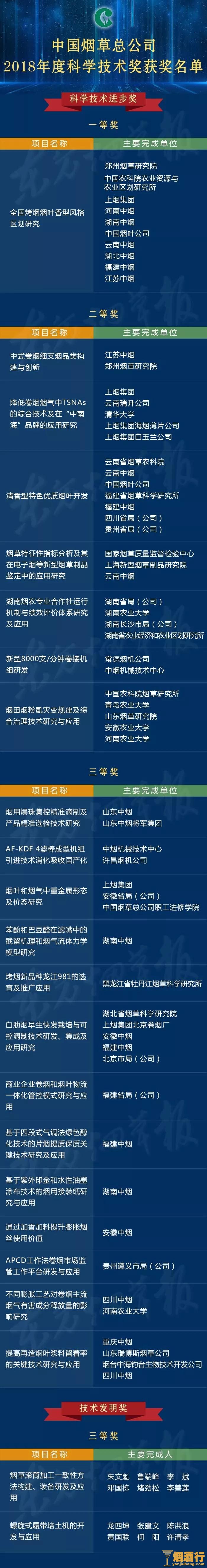 俗话说有压力才有动力,换句话,可以说是有目标有奖励,更有动力!烟草和叶也不例外,中国烟草总公司要求,行业科学技术工作者要向全体获奖者学习,继续发扬求真务实、勇于创新的科学精神。以下是小编为大家带来的2018年度科学技术奖励决定,1月10日,烟草行业公布的年度科学技术最高荣誉名单。
