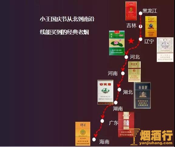 黑龙江上车,买到十元不贵的老八夺,吉林就是长白山777,到了辽宁可以看到娇子(大连浪漫),然后是河北钻石(荷花),到了河南就是黄金叶的故乡,硬帝豪,硬红旗渠,爱尚,湖北的黄鹤楼软硬珍品,护板的白沙、芙蓉王,广东的双喜(1906),到了海南就是终点:三沙(椰子金)。