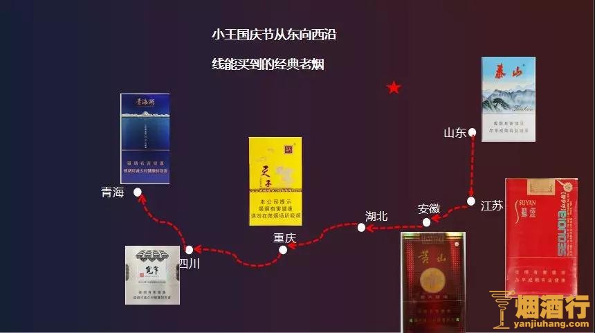 从山东出发,山东地区的大家熟知泰山将军烟,泰山新品,到了江苏地区,熟悉的江苏五星,软金砂,安徽经典的就是睆烟,湖北的就多了,楼颜的故乡,重庆大家都知道的天子(金),重庆四川的宽窄系列,青海:必须是娇子(青海湖纯净)。