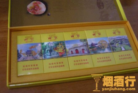 这款烟的售价为50元一包。这款烟有着五种不同的包装,五包烟的烟盒都是以明黄色为主,烟盒的真面是由五种不同的图案组成,都是以南京的当地名胜景点为背景,分别是夫子庙、中华门、天文台、中山陵、总统府,这五处。背面也有五种与之相对应的图案分别是:春到雨林、花开富贵、层林尽染、青龙腾飞、梅花挂枝。