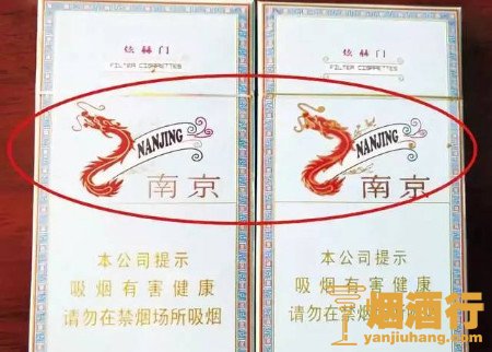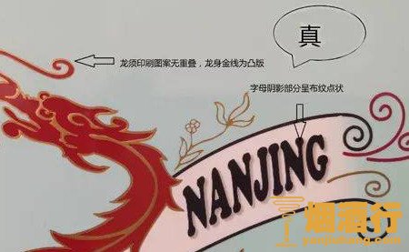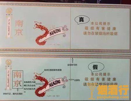 2、一般来说真烟的印刷都是由昂贵的机器完成,字体整齐颜色一致,图案清晰可见,字母图案呈凸印;而假烟南京二字不齐,龙身图案为褐红色,字体图案呈凹印,条盒金边有毛刺,即便肉眼看不出来,用手机照相红能放大看也能看得出来。