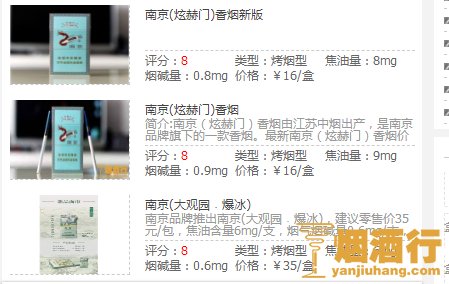 5、在南京牌香烟中找到南京炫赫门香烟,我们发现不仅有香烟的价格还有香烟的评分、类型、焦油量等。可以说是非常棒的了。