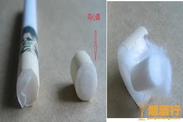 4、最容易辨别的就是烟支滤嘴的设计,真的黄鹤楼大彩,烟支滤嘴为两段,为了达到更好的降焦效果。最上面的一段中间有一根明显的降焦芯,下面一段就是普通的海绵体。而假烟烟嘴没有这些精细的设计。
